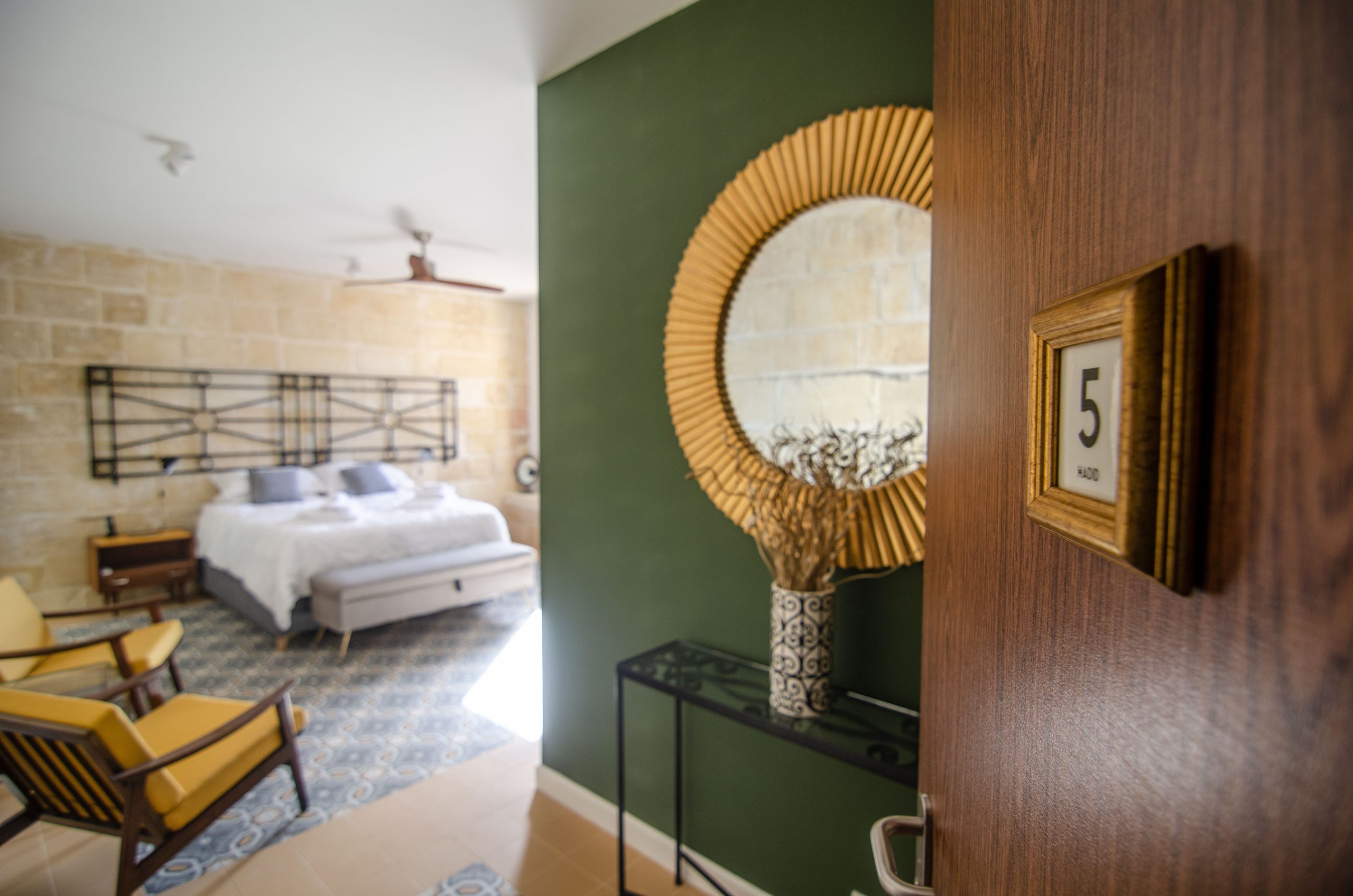 Aħdar is a charming first-floor suite with its own sitting area and an internal balcony that looks out over our peaceful inner courtyard. The bathroom is both elegant and indulgent, fitted with a walk-in shower and a beautiful freestanding bathtub.